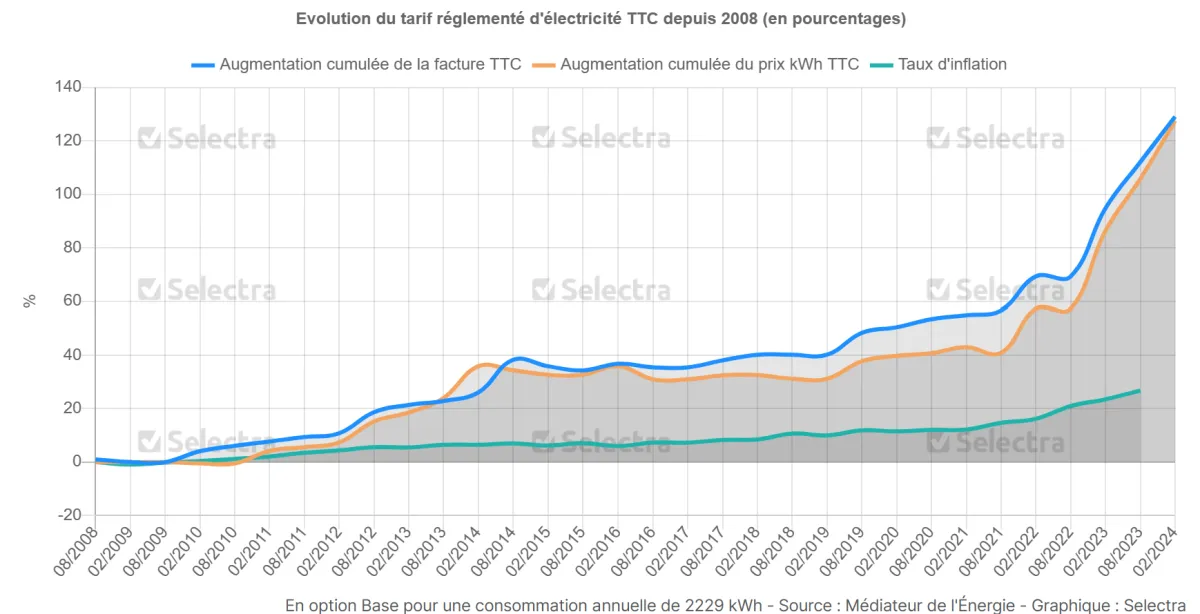 Le prix de l'électricité ne cesse d'augmenter chaque année. Depuis 2023 il a augmenté de + de 40%. Protégez vous contre cette inflation en produisant votre propre électricité avec nos panneaux.